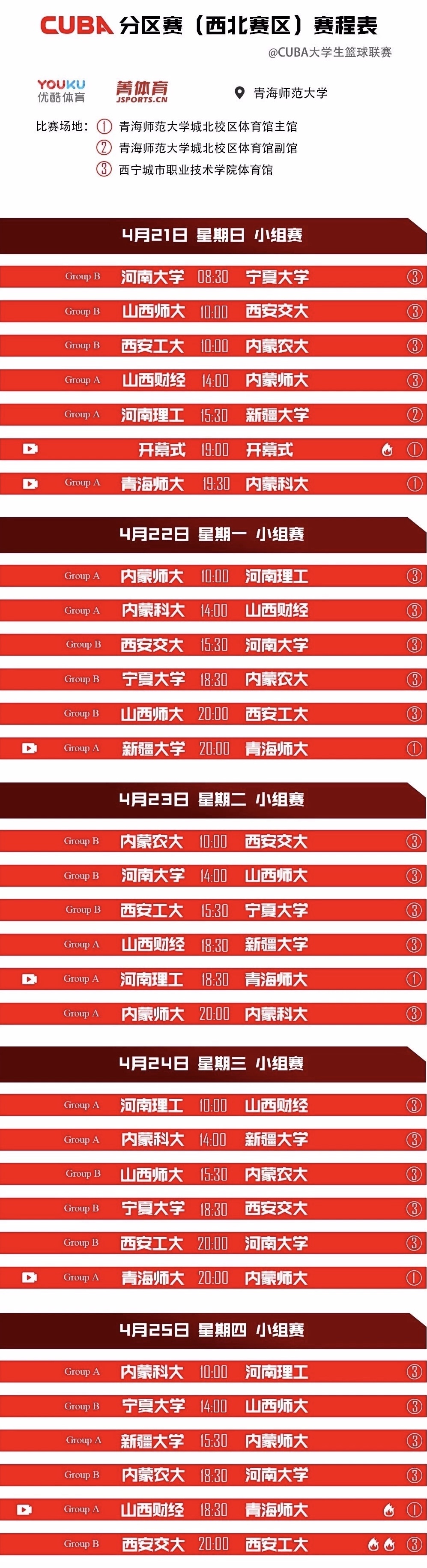 4月21日,由威尼斯官网积极承办的第21届中国大学生篮球联赛(CUBA)西北赛区比赛正式开赛。 本次赛事为期9天,分别在1号场地(青海师大城北校区体育馆主馆)、2号场地(青海师大城北校区体育馆副馆)、3号场地(西宁城市职业技...21 2019-04 -
