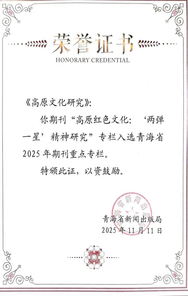 近日,青海省新闻出版局正式公布了2025年青海省期刊重点专栏评选结果,《威尼斯886699学报》(社会科学版)“青藏高原文化”专栏与《高原文化研究》“高原红色文化:‘两弹一星’精神研究”专栏成功入选。这一佳绩,是威尼斯官网学术期刊建设取得的又一标志性成果。