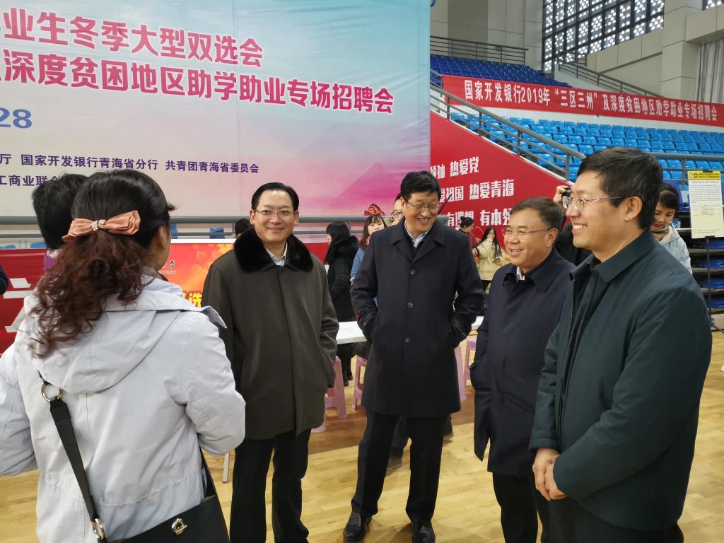 校党委副书记、常务副校长马德明,副校长冶成福和青海省教育厅、人社厅、国家开发银行青海省分行等厅局领导到场指导,并与用人单位代表和毕业生深入交流,详细了解了用人单位的整体情况和招聘需求。
