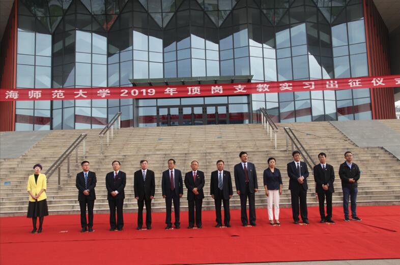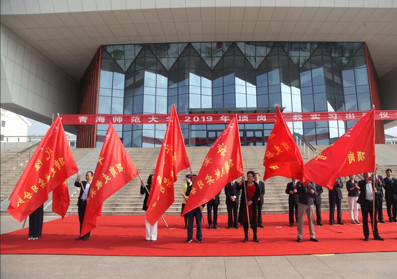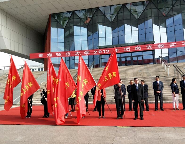 随后,省教育厅副厅长杨发玉、校长史培军、常务副校长马德明分别为2019年顶岗支教实习分队授旗。