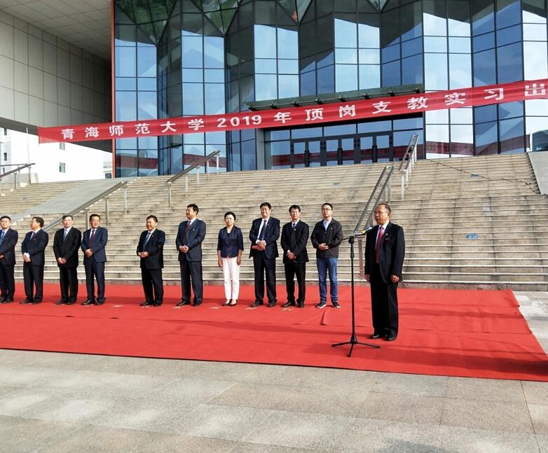 仪式首先由生命科学学院鲍敏教授代表顶岗支教实习驻县教师发言,鲍敏教授对校领导的信赖和支持表示感谢,并代表所有驻县教师做出郑重承诺,将圆满地完成支教任务。人文学院顶岗支教实习生马桂福代表顶岗支教实习同学做了发言,他认为教师不只是一个职业,更是一种信仰。作为新时代新青年应时刻谨记:以今日之我,逐明日之阳,要不负心中所想,去拼搏,去奋斗。副校长冶成福做了重要讲话。他代表学校向大力支持和帮助顶岗实习支教工作的单位表示感谢,向参加顶岗支教实习的学生和带队教师表示亲切的慰问!他表示,作为青海省教师教育的排头兵,学校要坚定不移地承担起振兴教师教育的责任担当和使命,为我省基础教育发展和“一优两高”发展战略做出积极贡献。在即将迎来建国70周年和青海省解放70周年的光荣时刻,学校要肩负振兴青海教育的时代使命。