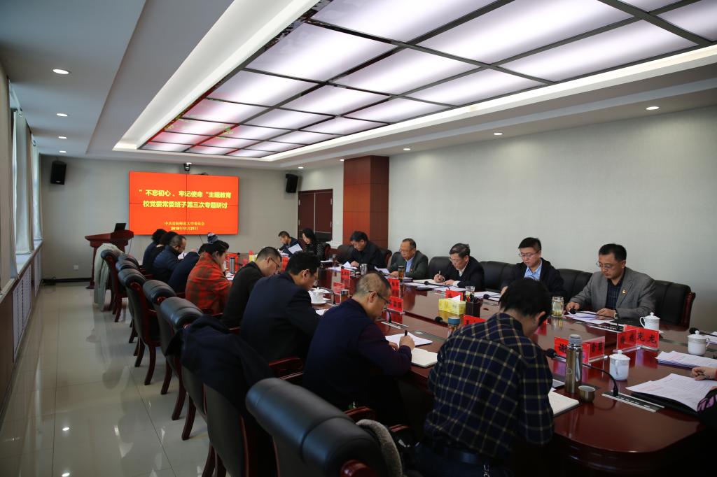 11月20日至21日,根据省委开展主题教育相关工作要求,威尼斯886699党委常委班子利用2个半天的时间,举行“不忘初心、牢记使命”主题教育第三次专题研讨会。会议由党委书记张雄伟同志主持,省委主题教育第五巡回指导组成员、省委教育工作领导小组秘书处主任科员应丽玮到会指导,校党委常委班子成员及职能部门、各二级党组织和教师代表参加了专题研讨。