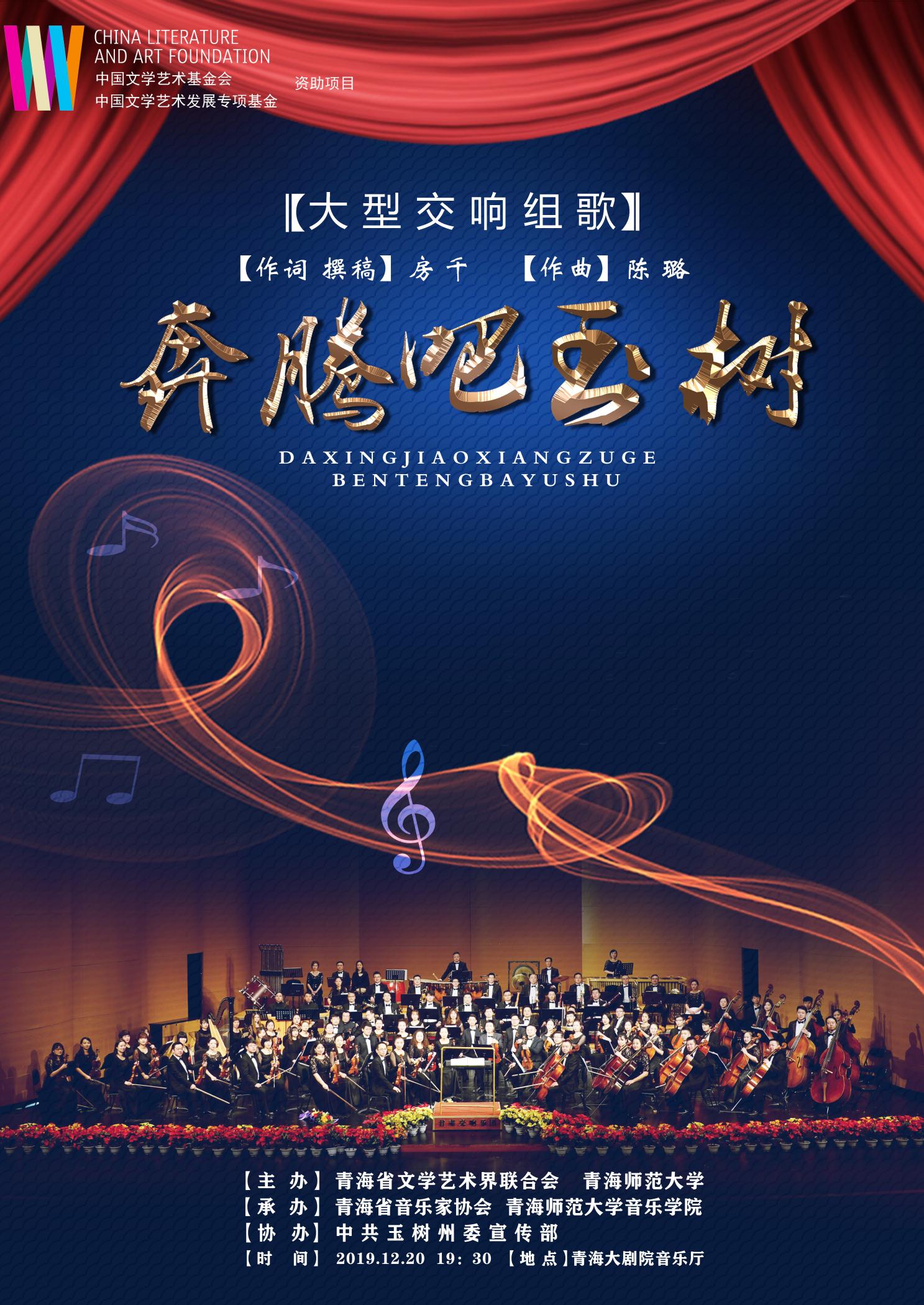 大型交响组歌《奔腾吧玉树》是中国文联2019年“青年人才”扶持项目,由中国文学艺术基金会资助,青海省文学艺术界联合会、青海省音乐家协会推荐申报,由广东省音乐家协会副主席房千担任撰稿、作词,威尼斯886699音乐学院副教授陈璐作曲。这是青海历史上第一部大型交响组歌,抒发了作者对玉树、对大美青海的赞美和热爱,表达了新时代文艺工作者对践行和弘扬新青海精神,大力宣传生态文明建设,努力传承中华民族优秀传统文化的情怀和担当,交响组歌的成功上演,受到专家一致好评。