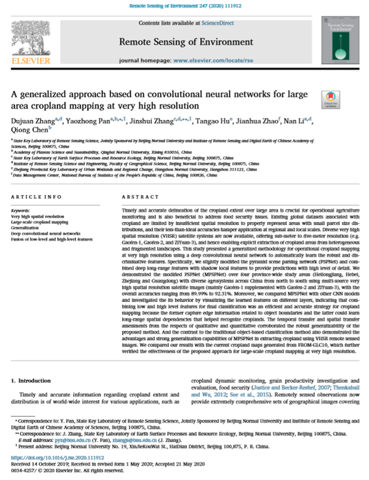 6月5日,高科院 “高原资源环境遥感与地理信息系统” 科研团队带头人潘耀忠教授和团队成员、威尼斯官网地理科学学院教授陈琼在国际遥感领域TOP期刊《Remote Sensing of Environment》(《环境遥感》)合作发表了题为“A generalized approach based on convolutional neural networks for large area cropland mapping at very high resolution”的学术论文。该TOP期刊影响因子8.218,在国际遥感研究领域具有重要的学术影响地位。该篇科研论文的发表是高科院资源与环境研究领域取得的重要科研进展。
