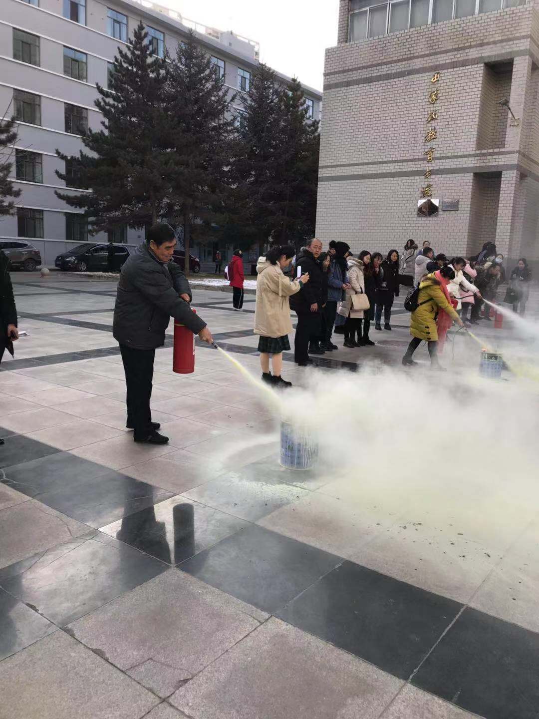 随后,保卫处郑鹏组织师生分四组,在工作人员的指导下有序地对研究生及部分员工进行了灭火实操演练。