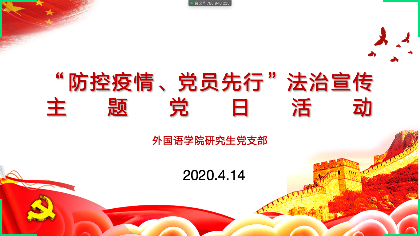 4月14日,外国语学院研究生党支部开展了以“防控疫情、党员先行”为主题的在线党日活动,支部全体成员参加活动,会议由支部书记籍天璐主持。