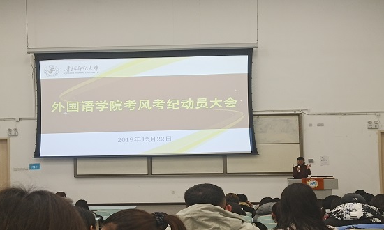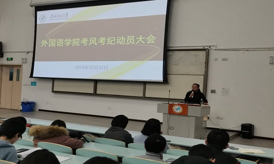 12月23日,外国语学院在东二楼F101教室召开了 “诚信考试”考风考纪动员大会,全院370余名学生参加了会议。会议由辅导员贾海英主持。