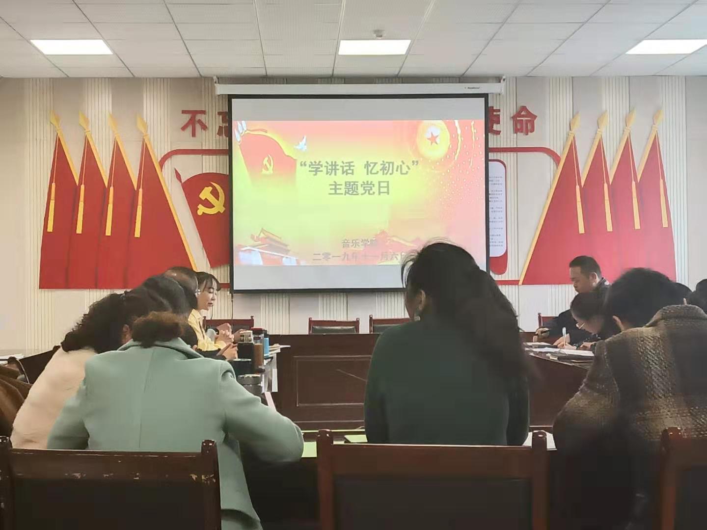 11月6日下午,音乐学院在学院三楼会议室召开“学讲话,忆初心”主题党日暨集体学习活动,活动由音乐学院党总支副书记宋睿青主持,全体师生党员参加了活动。