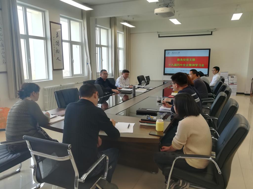 为深入宣传、学习、贯彻好党的十九届四中全会精神,11月18日上午,教务处党支部召开十九届四中全会精神学习会,会议由教务处党支部书记马俊主持,教务处党支部全体党员参加了会议。