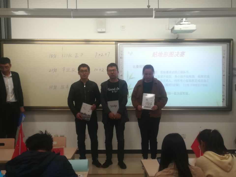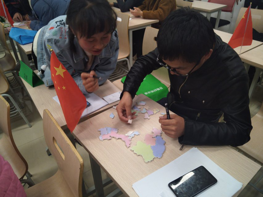 决赛环节,工作人员为参赛小组发放中国地图和我国地形小贴纸,各小组在地图上将相应的地形粘贴,经过第二轮的磨合,小组之间更加默契配合。