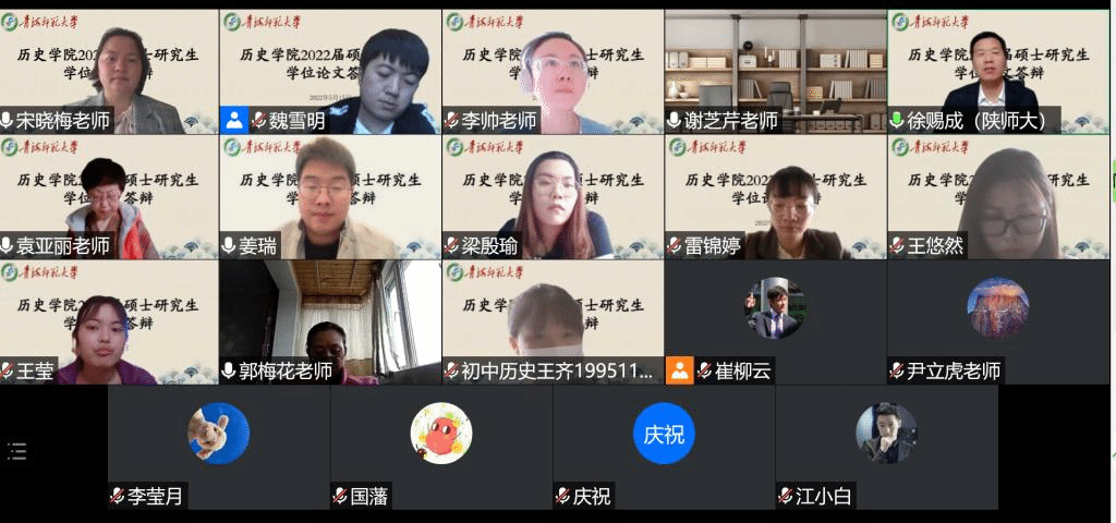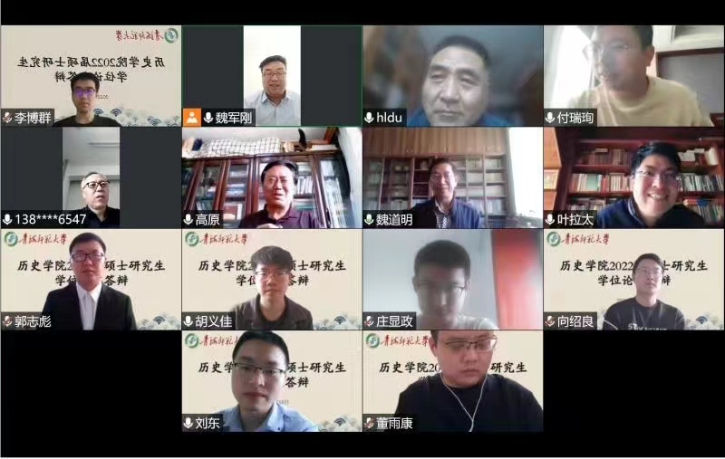 根据学院部署及相关工作安排,5月15日,历史学院举办2022届硕士学位论文答辩会,结合疫情防控要求,本次论文答辩通过腾讯会议平台,以线上答辩的形式顺利进行。