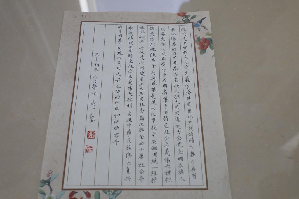 比赛现场,主持人介绍了比赛规则和要求、比赛流程和奖项设置。钢笔字和粉笔字在西2楼313教室进行,毛笔字在西2楼307教室和309教室进行。书法是中华文化的瑰宝,凝结着中华民族的智慧,赛场上选手们挥洒自如,刚强有力的字体蕴含着对中华传统文化孜孜不倦的追求与探索。在书写钢笔字时,选手们淡定自如,胸有成竹,神情专注地写每个字。粉笔字工整清秀,钢笔字苍劲隽美,毛笔字遒劲流畅,可谓墨香满堂。创作内容主要围绕习近平新时代中国特色社会主义思想、弘扬爱国奋斗精神等重要论述和名人名言,内容积极向上。同学们完成创作后,由评委老师现场评选出优秀作品和获奖选手,体现了公平,公正,公开的比赛原则。