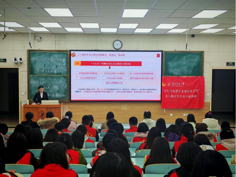 夜幕降临,城北校区东二楼101教室灯火通明,100余名同学齐聚一堂。第五组宣讲学员以党的二十届四中全会为主线,通过“重要地位—主要目标—青年使命”三维解读框架,用“案例 + 地域实践”的方式让抽象理论落地。