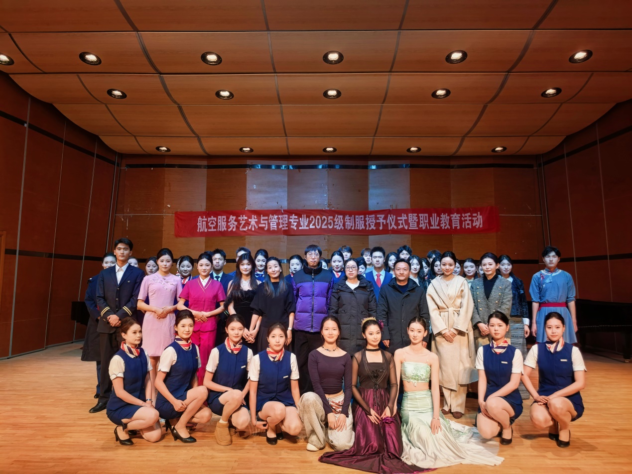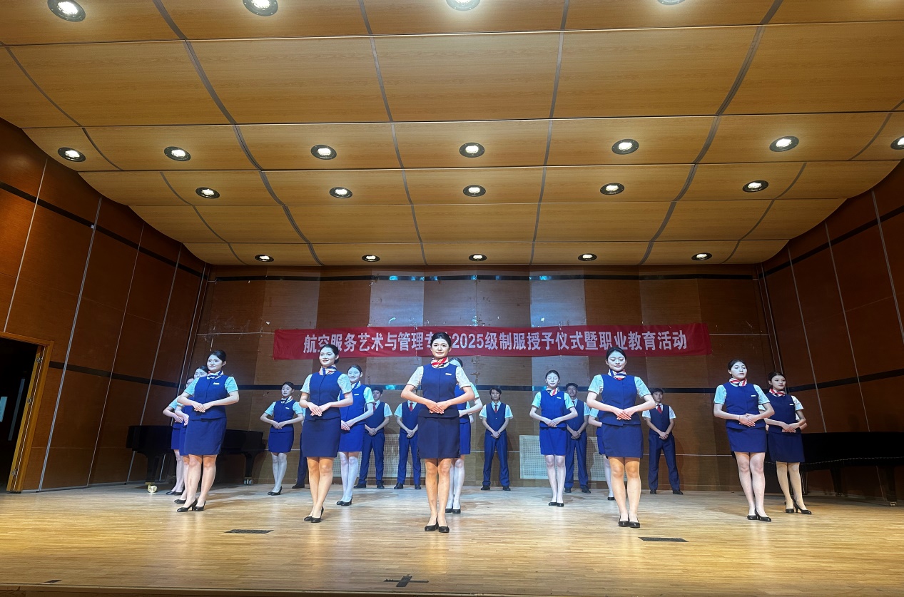 为增强2025级航空服务艺术与管理专业学生专业认同感,提升对民航事业的热爱,规范着装管理、强化自律意识,12月11日,音乐学院举办2025级新生制服授予仪式暨职业教育主题活动。
